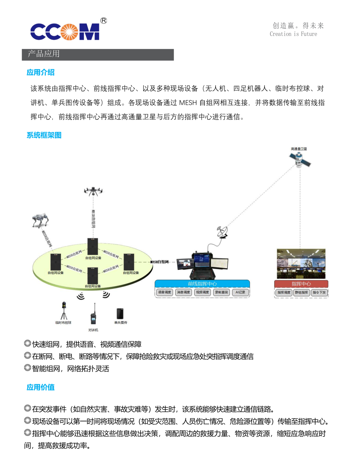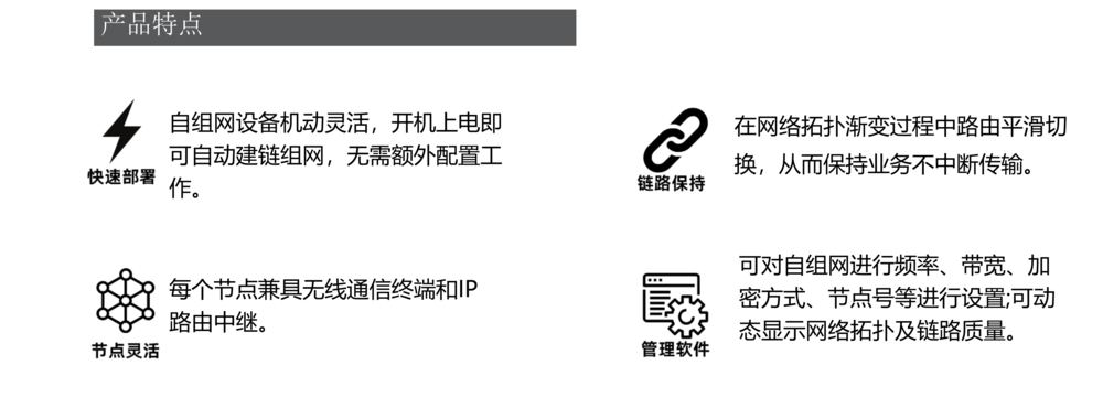 本产品不依赖任何基础通信设施,无中心多节点 互联。可临时、动态、快速构建一个无线 IP 网 络,具有自组织、自恢复、高抗毁的能力,支撑 数据、 话音、视频等多媒体业务多跳传输。